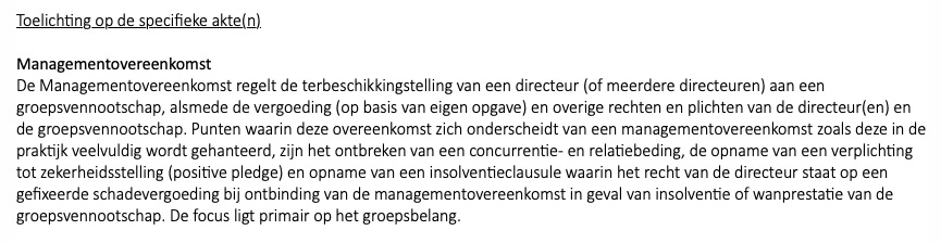 Bij het opstellen van een akte wordt er in Newgreement een document aangemaakt die dient als juridische bijsluiter. In dit ene document wordt per verschillende soort akte een toelichting uitgewerkt die de inhoud van de akte in context plaatst en waar nodig aanvullende bepalingen of aandachtspunten beschrijft. Zo borg je volledigheid, transparantie en juridische zorgvuldigheid, zonder extra werk.