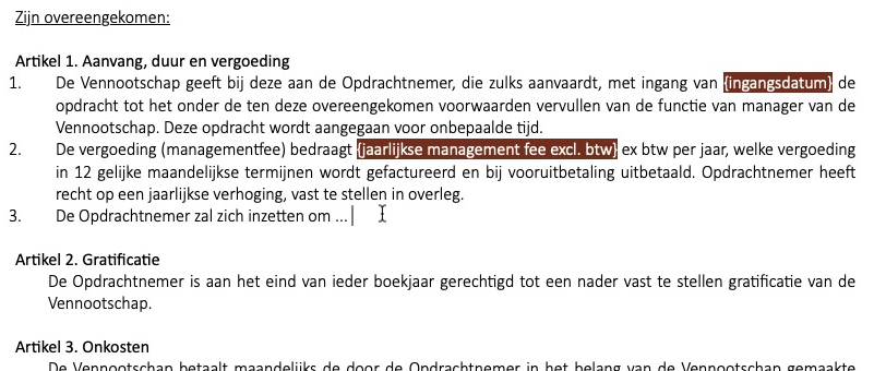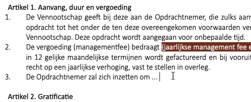 Een akte wordt in beginsel opgesteld op basis van jouw (standaard)template. Wanneer je van (een deel van) de template wilt afwijken dan kan er handmatig maatwerk en andere wijzigingen worden doorgevoerd.