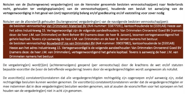 Bij iedere akte genereert Newgreement direct de notulen van de algemene aandeelhoudersvergadering. Voor elke Nederlandse besloten vennootschap wordt een tekststring opgesteld met de actuele bedrijfsgegevens en worden alle vergadergerechtigden benoemd.