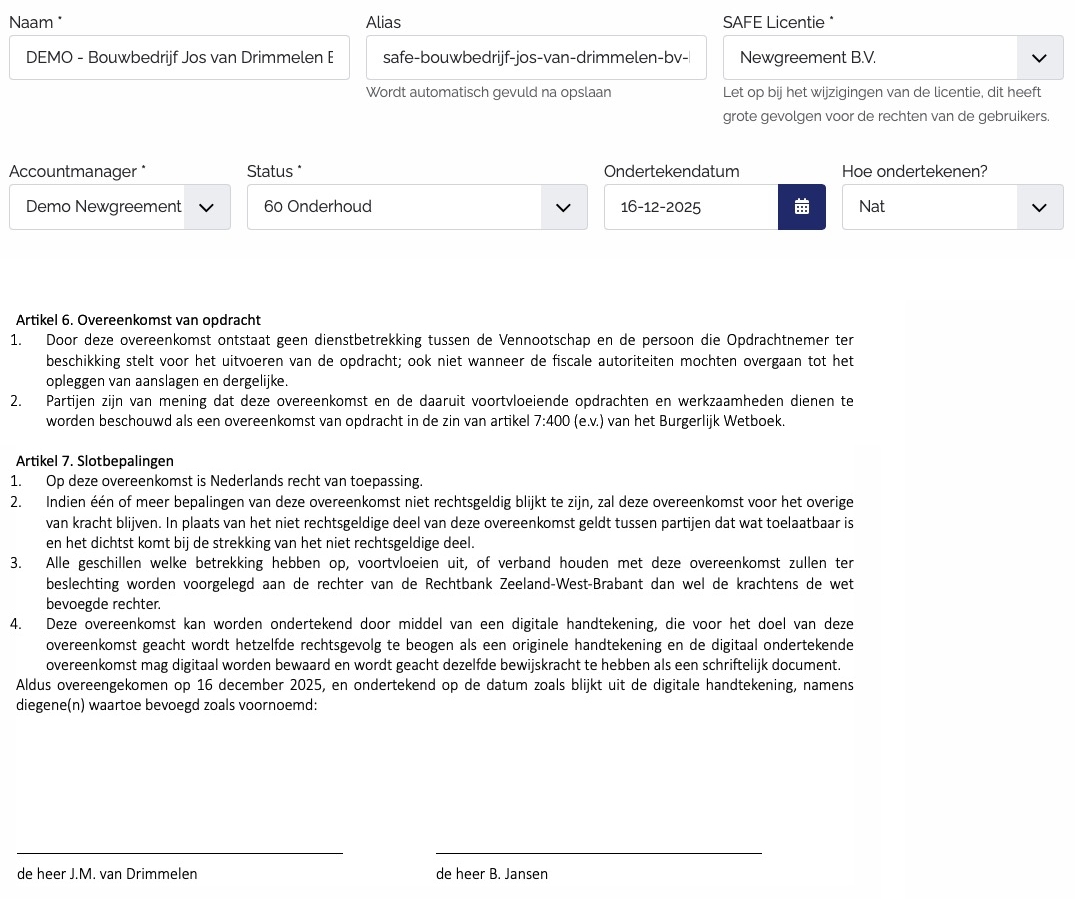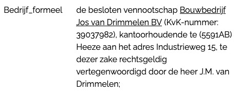Voor elke betrokken partij schrijft Newgreement een tekststring uit op basis van de bedrijfsgegevens uit de Kamer van Koophandel. De tekenbevoegde personen worden automatisch geïdentificeerd en voorzien van een handtekeningveld.