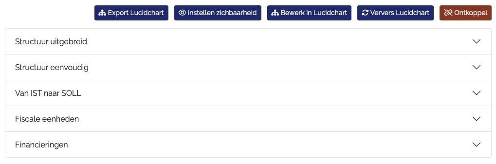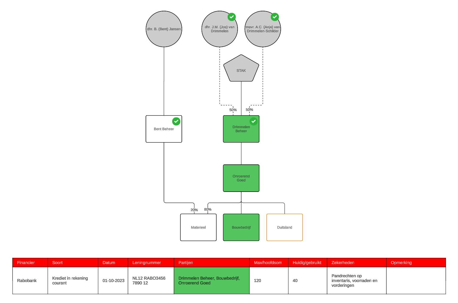 Voeg concernfinancieringen toe in Newgreement. Betrokken entiteiten krijgen een aparte kleur in de Lucidchart-tekening. Alle financieringen worden daarnaast overzichtelijk samengevat in een tabel op hetzelfde verkorte diagram.