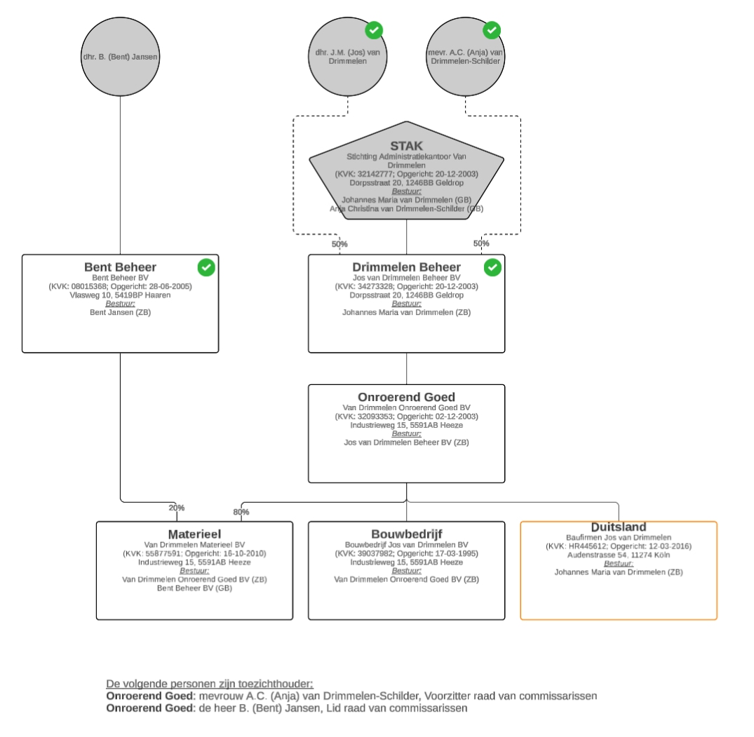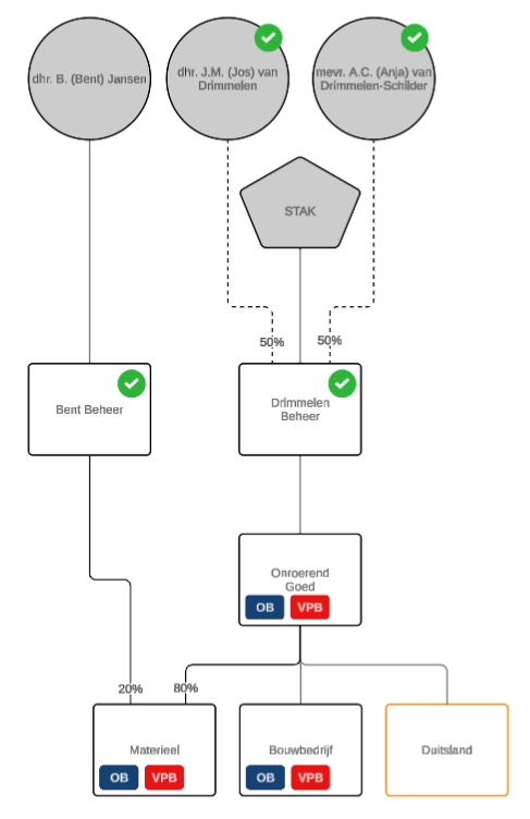 Zowel een uitgebreide als een verkorte diagram wordt uitgewerkt. Op het uitgebreide diagram zijn onder andere de KvK-nummers, adresgegevens, bestuurders en aandeelhouders terug te vinden. Op het verkorte diagram staan enkel de aandelenverhoudingen en naam van de entiteit.