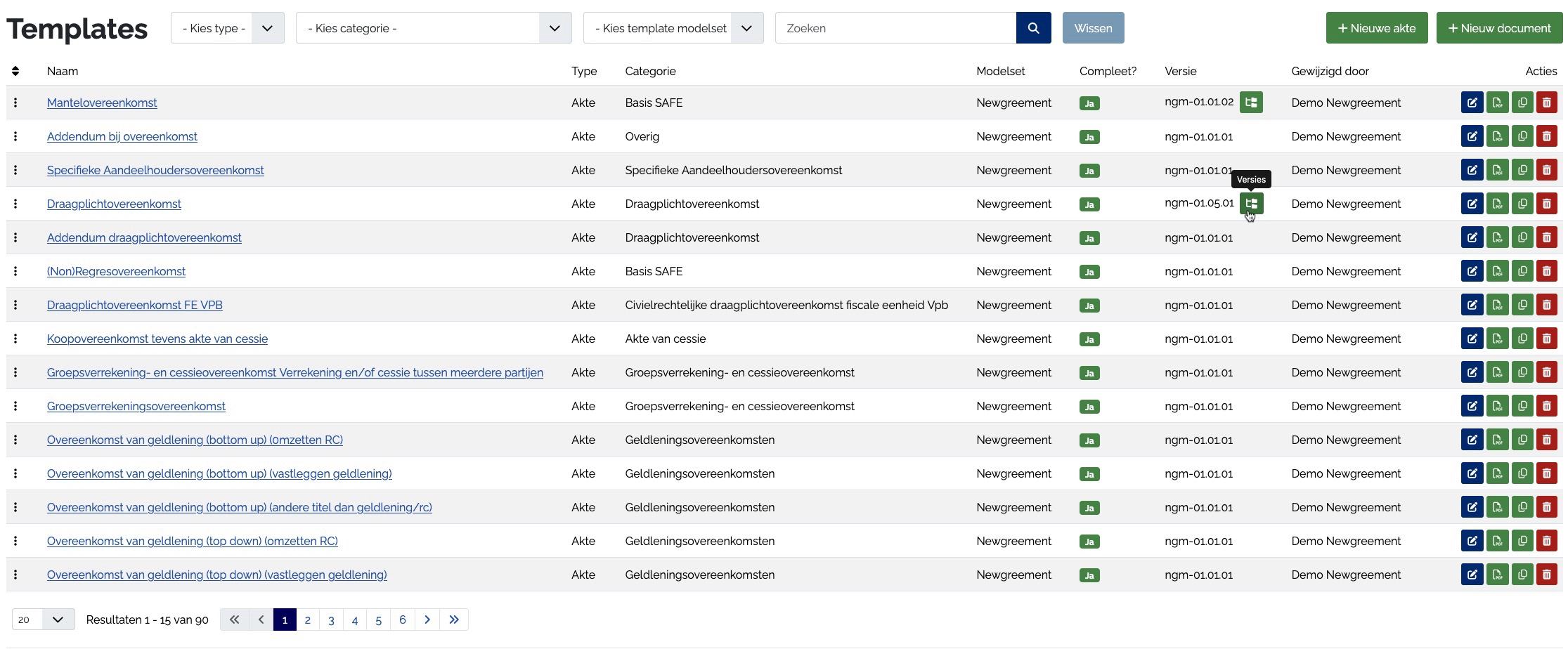 Met Newgreement beheer je alle akte- en documenttemplates centraal. Je bepaalt zelf de vormgeving, inhoud en placeholders. Je beschikt over robuust versiebeheer (major/minor/patch), en ziet in elk dossier direct of er een nieuwe versie beschikbaar is - met een duidelijke templatevergelijking en verschillenanalyse. Met één klik update je de akte of document.