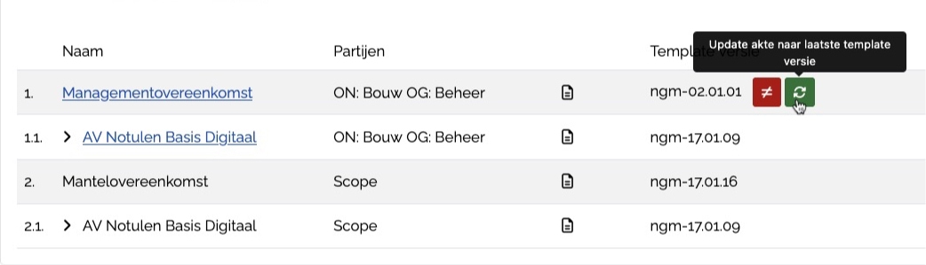 Zodra er een nieuwe templateversie is, toont Newgreement dit actief in relevante dossiers - zowel bij reeds getekende akten als bij akten in voorbereiding. Je kunt binnen het dossier meteen de templatevergelijking en verschilanalyse bekijken en bepalen of je de update wilt doorvoeren.
