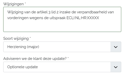 Bij elke wijziging leg je het type, de inhoud en de reden vast. Newgreement verhoogt daarop het versienummer en bouwt zo een audit-proof wijziglog.